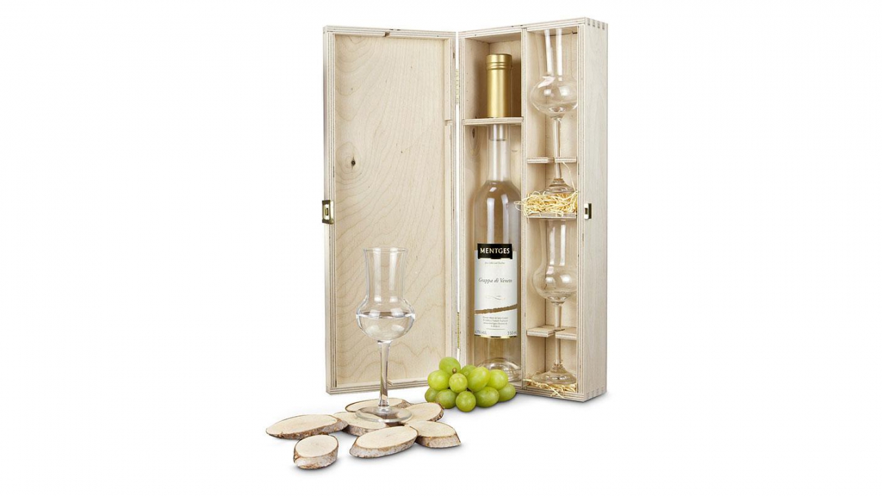 Der Grappa aus dem Hause Mentges sowie die beiden Schnapsgläser finden bequem in der Holz-Box Platz.