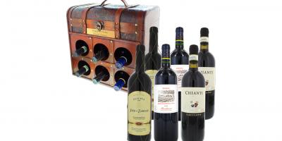 Ein sehr opulentes Weingeschenk, das Eindruck macht. Verschenken Sie 6 europäische Rotweine in einer Weintruhe!