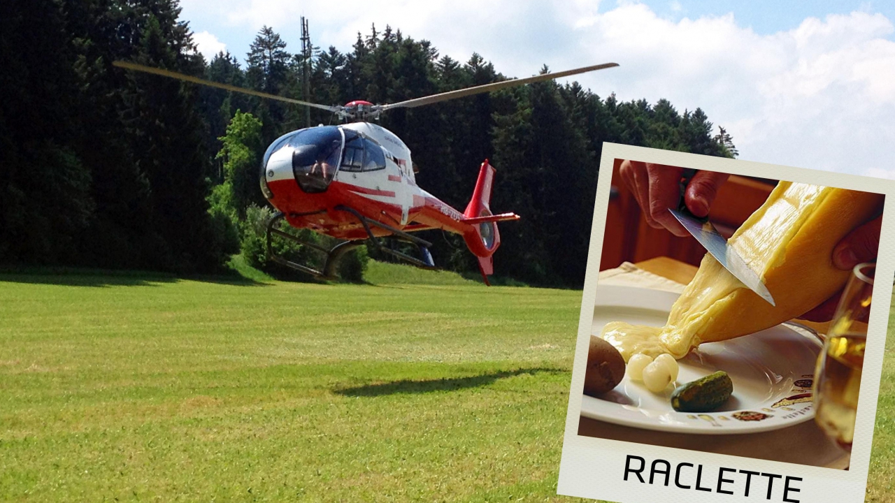 Am Mittag werden Sie mit feinem Raclette serviert, welches aus ausgezeichneter Bellelay-Käse zubereitet wird. Die Hubschrauberflüge beginnen am Morgen und dauert 20 Minuten.