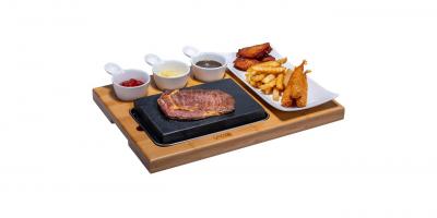 Wann hast du deine Freunde zum letzten Mal mit einem selbstgekochten Abendessen bei dir zu Hause verwöhnt? Zeit für etwas Zeit für euch - und mit dem Hot-Stone Steak-Set kann es auch mal ein richtig luxuriöses Steak sein. Serviere deinen Freunden ihr Steak auf einer edlen Platte aus echtem Lavastein, der das Fleisch noch lange warmhält. Die drei Keramikschalen eignen sich hervorragend für verschiedene Saucen, denn es muss ja nicht immer nur eine sein. Auf der Keramikplatte finden die Beilagen elegant ihren Platz.