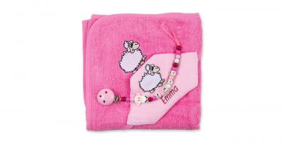 Das tolle Geschenkset besteht aus einem hochwertigen, rosa Kapuzenbadetuch und einem schönen Nuscheli. Wählen Sie Ihren Wunschnamen, welcher dann Ton in Ton aufgestickt wird. Das Geschenkset wird von einer farblich passenden Nuggikette abgerundet, auf welchem der von Ihnen gewählte Name ebenfalls aufgebracht wird. Zudem ist ein süsses Schafmotiv aufgestickt.