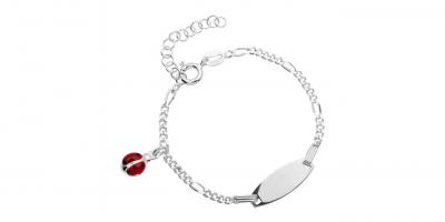 Poliertes 925 Silberarmband für Kinder mit Marienkäferanhänger. Das Armband verfügt über eine Gravurplatte und kann dank einer integrierten Verlängerungskette von 12 bis 15cm getragen werden.
