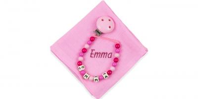 Rosa Nuscheli, personalisiert mit Ihrem Wunschnamen, und dazu eine farblich passenden Nuggikette.