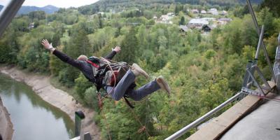 Der Pendelsprung vom Viaduc du Day über der Orbe wird an einem riesigen Pendel durchgeführt. Mit zwei Seilen gesichert, lassen Sie sich in die Tiefe fallen, wo Sie hoch über dem Boden in Bogen mit Radius 20 Meter hin- und herpendeln.
