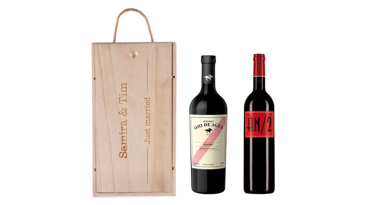 Die exklusive Weinkiste präsentiert eine harmonische Kombination aus zwei erlesenen Weinen: AN/2, ein charaktervoller Tropfen von ausgezeichneter Qualität, begleitet vom biologischen Ojo de Agua Malbec.