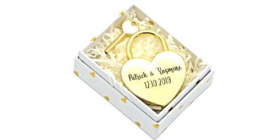 Schenken Sie Ihrem liebsten Menschen eine symbolische Verbindung für die Ewigkeit. Graviert mit Ihren Namen und einem für Ihnen ganz besonderen Datum, wird das Herzschloss zum persönlichen und romantischen Geschenk für Verliebte und Pärchen. Das Liebeschloss wird in einer edlen Geschenkbox geliefert.