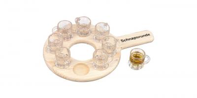 Das runde Holzbrett mit der Aufschrift "Schnapsrunde" und die dazu passenden Schnapsgläser erheitern jede Party!
