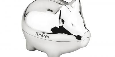 Das personalisierbare versilberte Sparschwein ist ein ausgezeichnetes Geschenk und überall ein Hingucker.