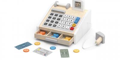 Einmal zahlen, bitte! Das ist kein Problem mit dieser schönen Spielkasse aus hochwertigem Holz. Mit der Kasse macht der Spielealltag im Einkaufslädeli gleich noch viel mehr Spass. Die Spielkasse beinhaltet alles, was es braucht, um Zahlungen abzuwickeln – von Produkt-Scanner, Kreditkarte bis hin zu Bargeld.