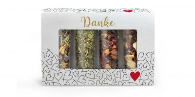 Verleihen Sie Ihren Dankesworten eine besondere Note mit unserem 4-er Tee Shot Geschenkset, das mit einem herzlichen ''Danke'' verziert ist.