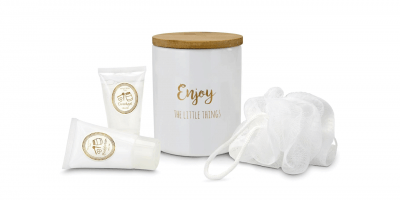 Das wohlriechende Duschgel reinigt deine Haut sanft, der weisse Mesh-Schwamm entfernt Hautschuppen und regt die Durchblutung an. Danach verwöhnt die leckere Bodylotion deine Haut. Für Ordnung in deinem Badezimmer: Das Wellness-Zubehör kann im Handumdrehen im mitgelieferten Keramikgefäss mit dem goldenen Aufdruck "Enjoy the little things" verstaut werden. Für streichelzarte und gesund strahlende Haut!