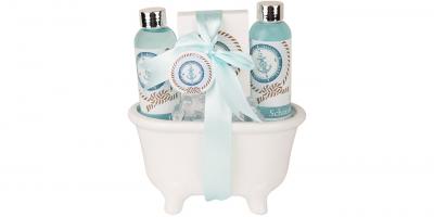 Wellness in Ihrem Badezimmer: Schalten Sie ab und geniessen Sie die komplette Entspannung: Die niedliche Keramik-Wanne passt wunderbar in jedes Badezimmer und ist gefüllt mit 150 ml lecker duftendem Duschgel, 150 ml Schaumbad, 200 g Badesalz und einer Massagebürste aus Kunststoff für streichelzarte Haut. Der herrliche Duft der Badezusätze komplettiert das Badeerlebnis und garantiert Entspannung pur!