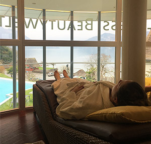 Kurz darauf warfen wir uns in unsere Badeklamotten und erkundeten den Wellnessbereich. Wir liessen uns im Aussenbecken von der starken März-Sonne blenden und entspannten halb aufgeweicht auf den Liegestühlen, eingepackt in Bademantel und Wolldecke. Nach einem kurzen Snack, den Besuchern stehen Äpfel, Tee und Wasser zur Verfügung, wollte ich an der Reception einen Beauty-Termin für Augenbrauen färben vereinbaren. Die nette Kosmetikerin war jedoch so spontan, dass sie mich bat gleich mitzukommen. Diese unkomplizierte Art beeindruckte mich und ich fühlte mich gleich noch wohler.