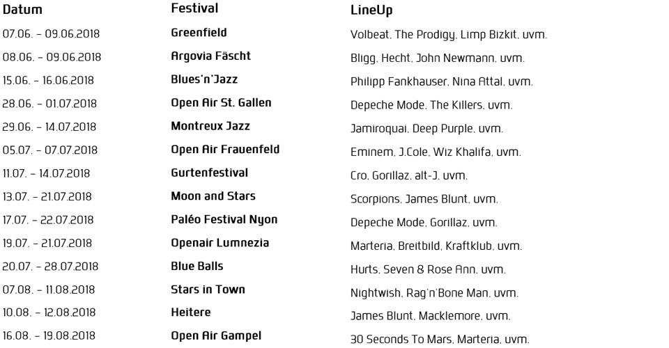 Ein Plan ist gut, Spontanität ist besser. Nirgendwo kann mehr dazwischenkommen als an einem Openair - sei es Müdigkeit, Hunger, ein heisser Flirt, Rumgezicke oder schlechtes Wetter. Für alle die trotzdem die Übersicht der Acts im Blick behalten möchten: die meisten grossen Festivals haben mittlerweile eine App, mit welcher man eine Favoritenliste machen kann - min. 15 Minuten vor Konzertbeginn wird man von der App erinnert.